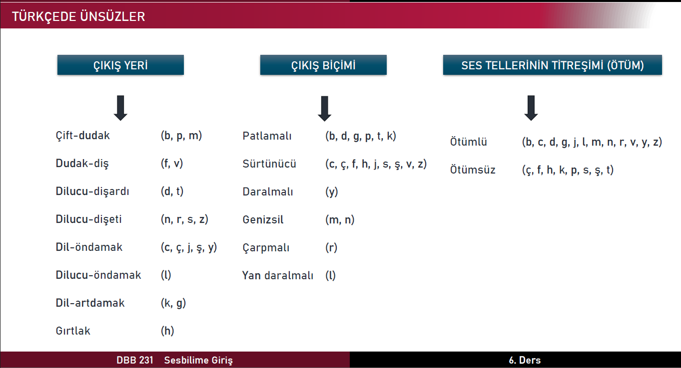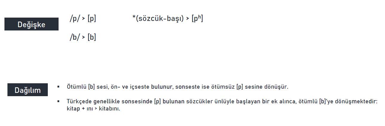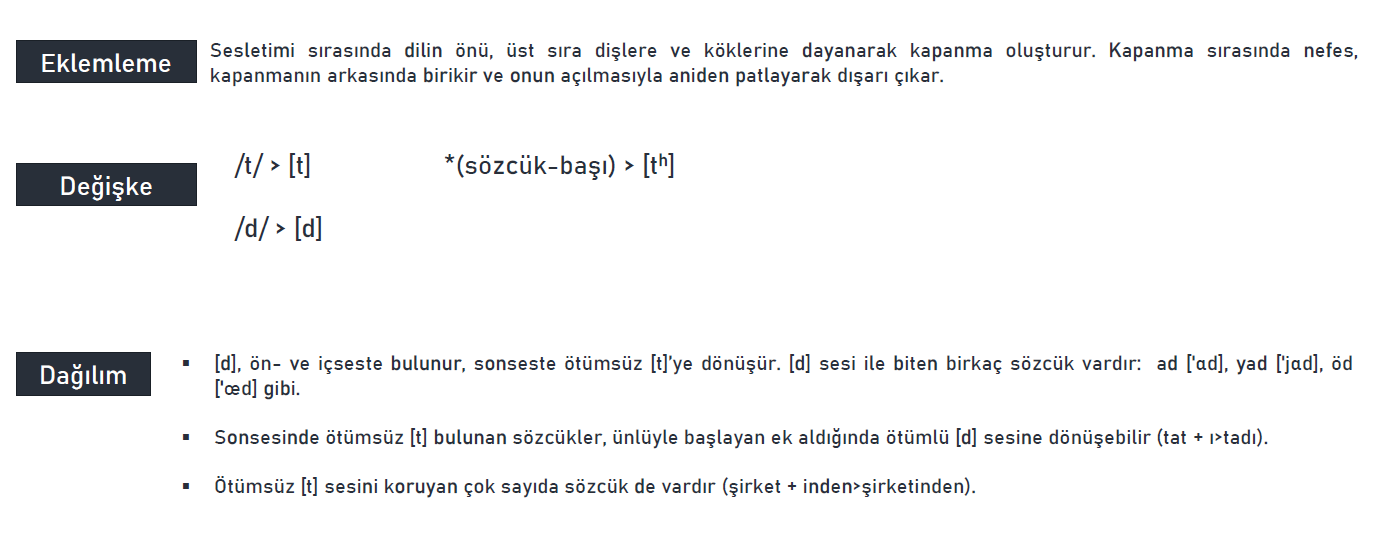 T ve D [d], ön- ve içseste bulunur, sonseste ötümsüz [t]’ye dönüşür. [d] sesi ile biten birkaç sözcük vardır: ad [‘αd], yad [‘jαd], öd [‘oed] gibi.