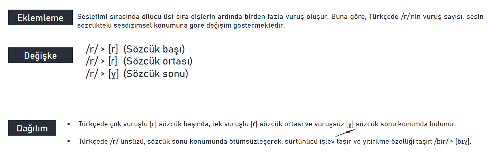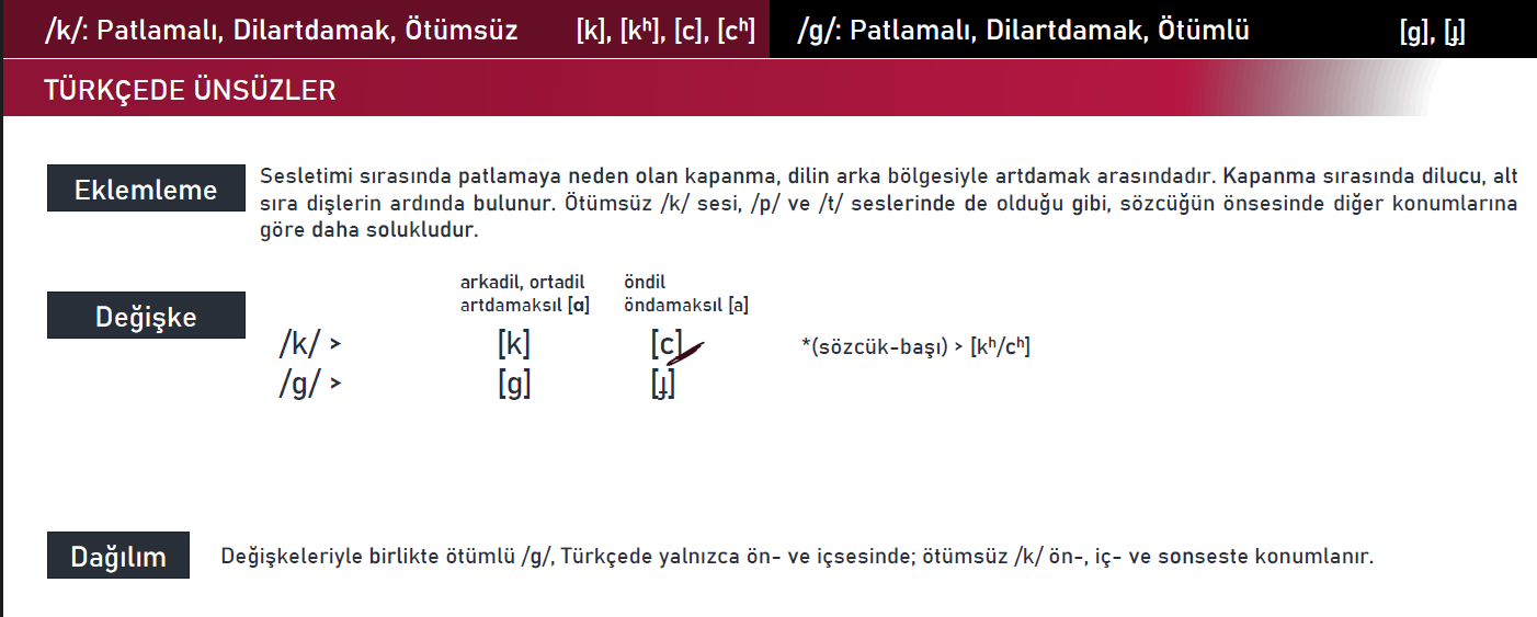 ▪ /n/, Türkçede iç- ve sonseste dil-artdamak ünsüzleri /k/ ve /g/ ile konumlandığında ise, boğumlanma özelliğini kaybederek [ŋ] değişkesine dönüşmektedir: renk [rεŋc] gibi.