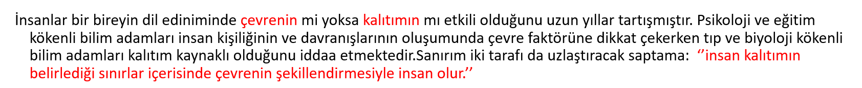Sanırım iki tarafı da uzlaştıracak saptama: "insan kalıtımın belirlediği sınırlar içerisinde çevrenin şekillendirmesiyle insan olur."id: 1743868649711
