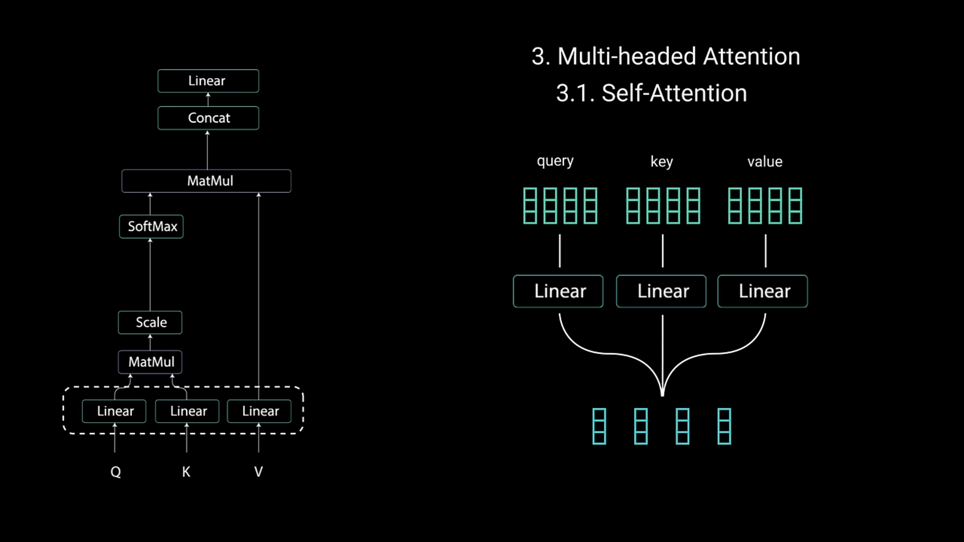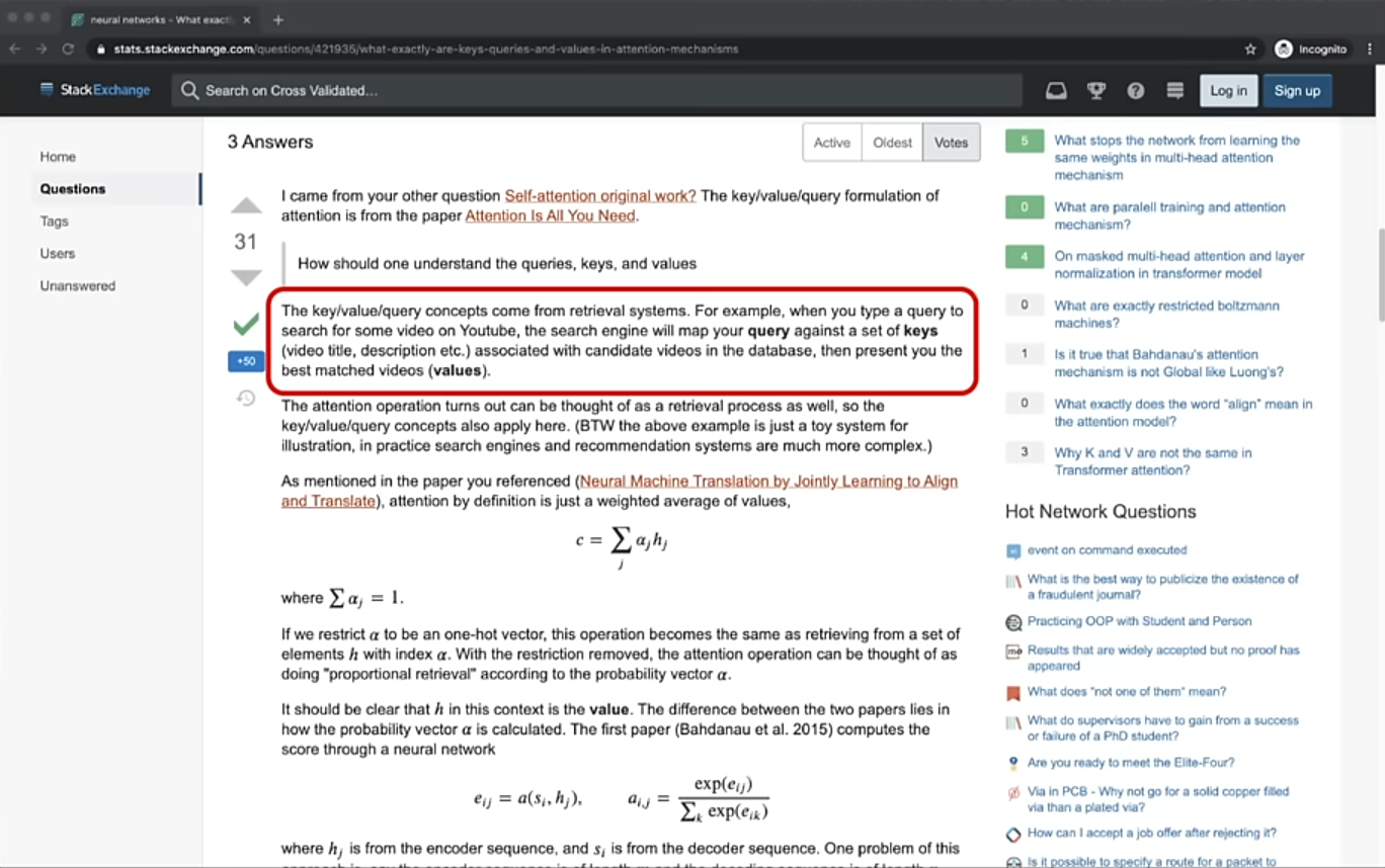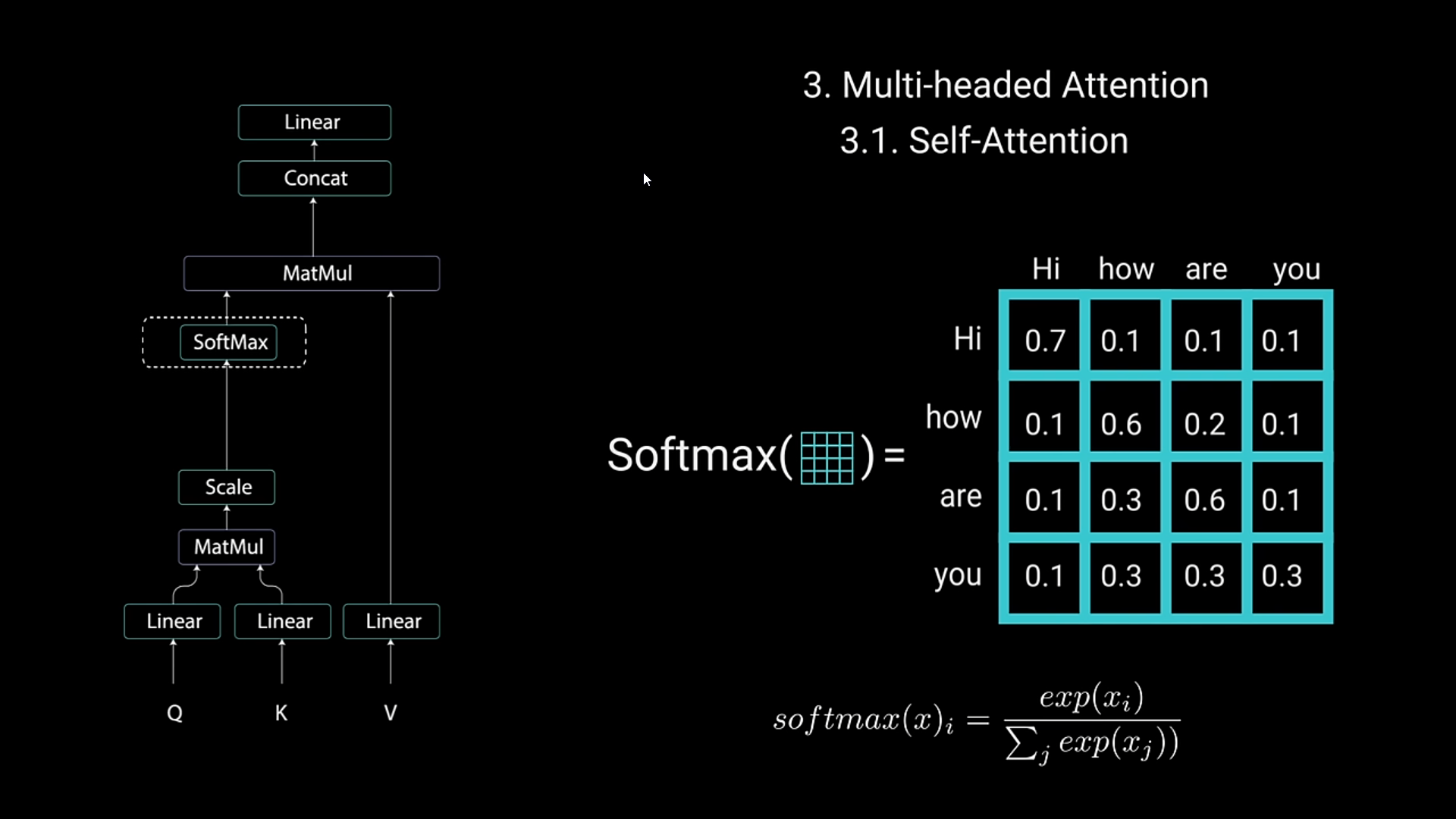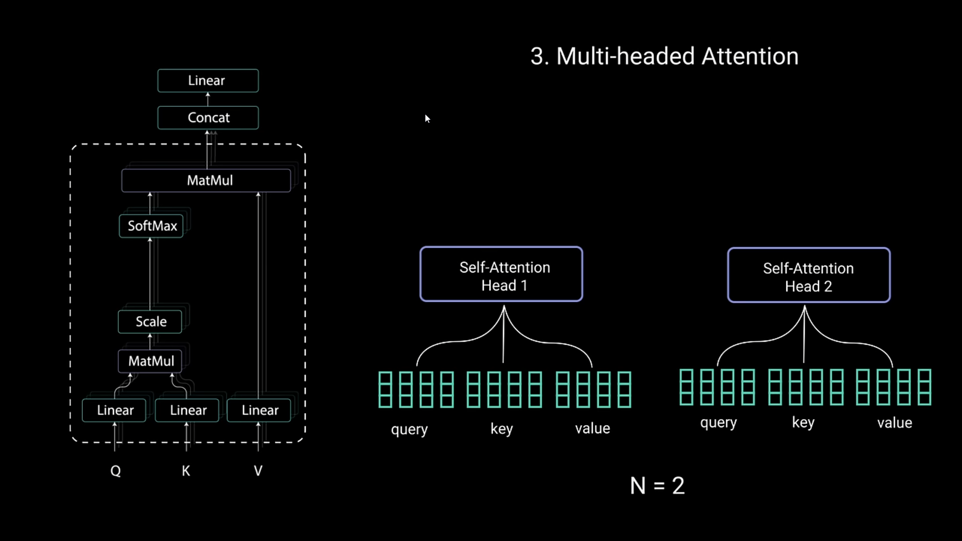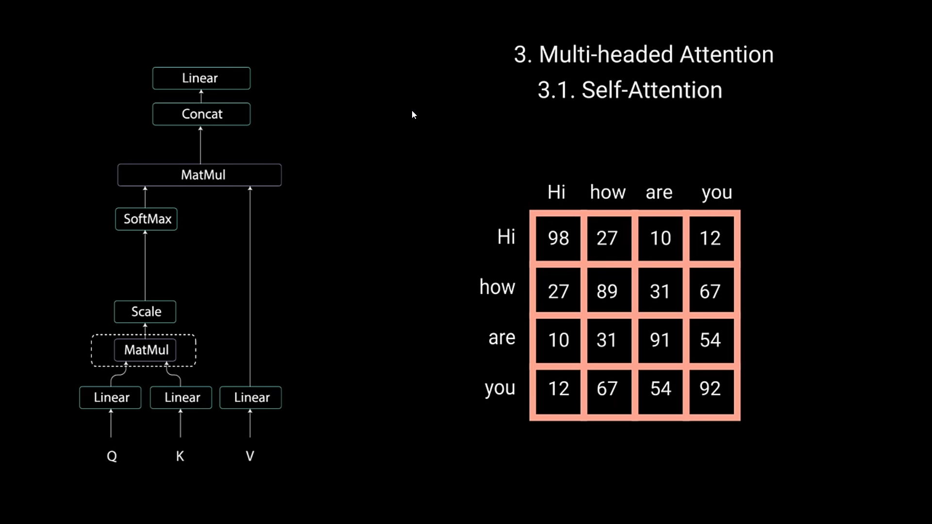 - Self attention’s base is created by Query, Key and Value prompts. You query youtube with keys like transformers, losing focus… and it gives you an output of values that you searched for