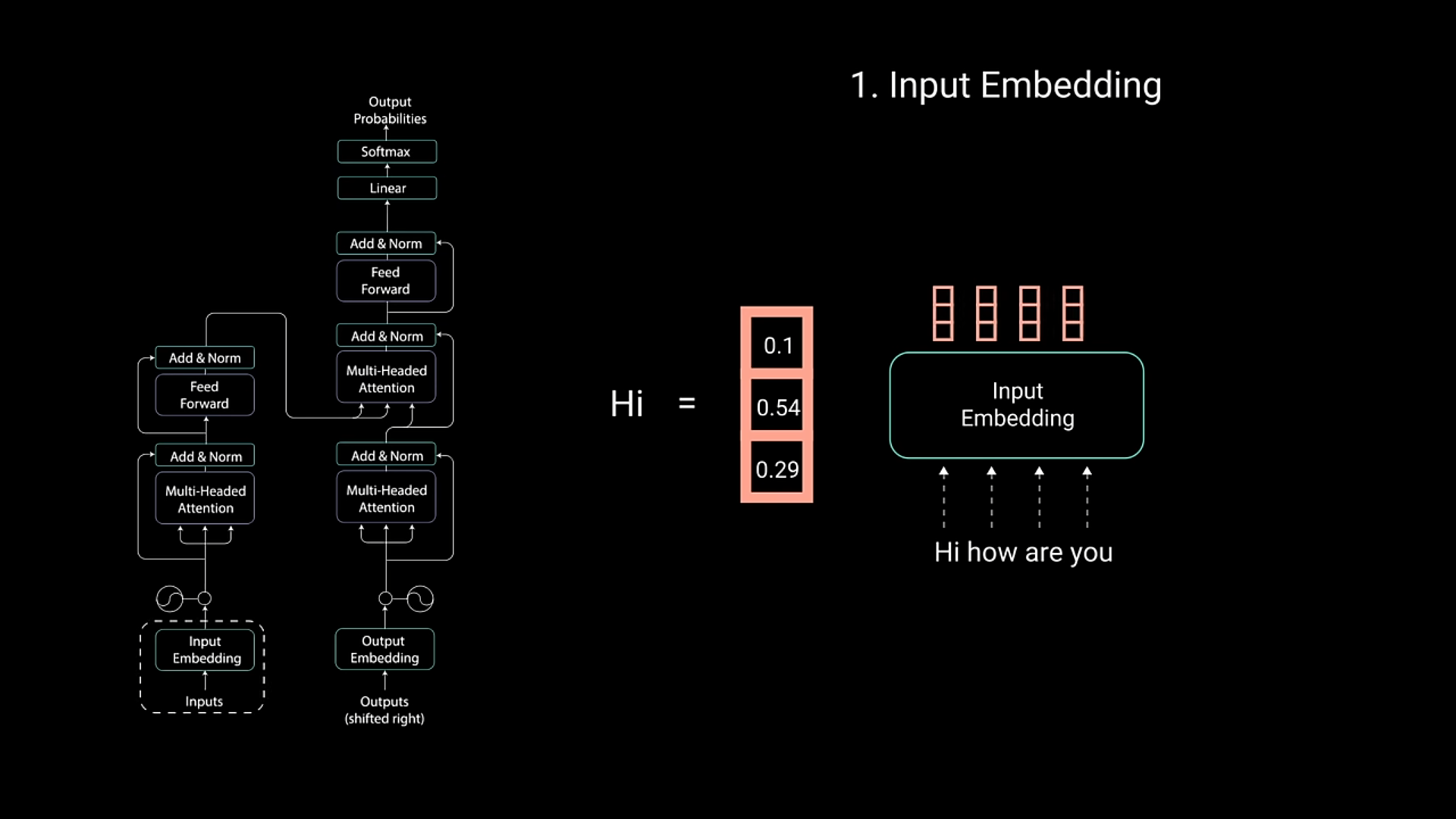 Input Embedding is processed by assigning it a continuous value that represents how much weight(or attention?) should be given to a word.