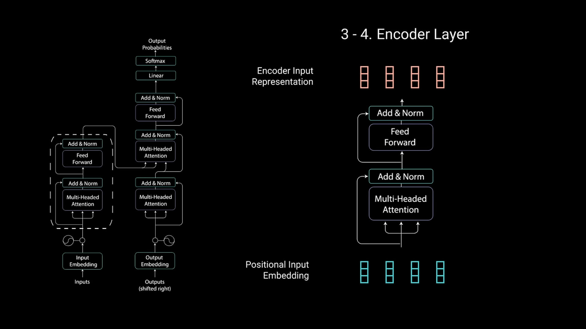 Encoder Layer consists of Multi-Headed Attention and Feed forward, with “Add & Norm” containing “Residual Info”