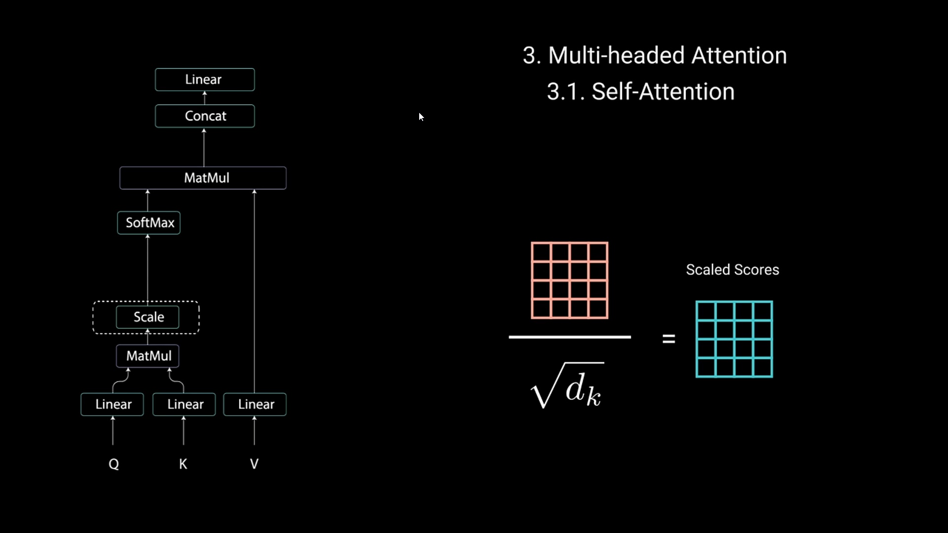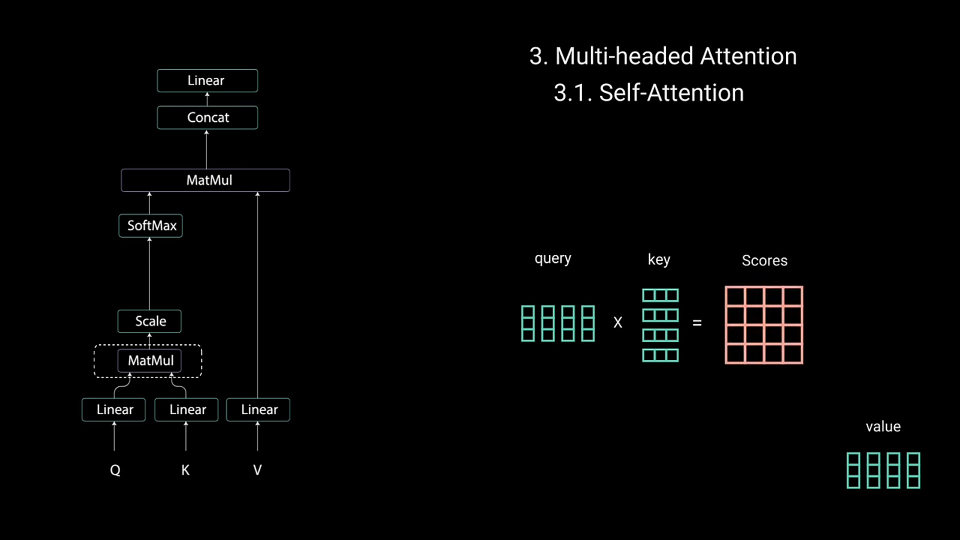 - Query and keys are used in a dot multiplication metrix that gives out scores of each value